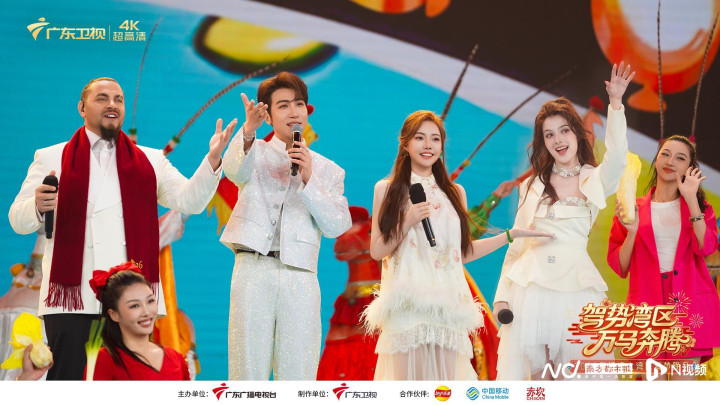 大湾区的年味,十分多元、更具活力——威神V(WAYV)携《BIGBANDS(狂想曲)》《GiveMeThat》热力登场,将潮流旋律与新春喜气巧妙相融;曾舜晞倾情演唱《吻你吻上太空》,以浪漫旋律铺展逐梦星河的壮美画卷。