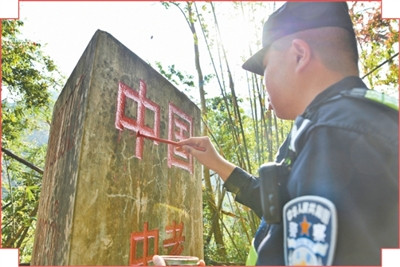 穿越南腊河上的吊桥,再绕过一个山坡,中老缅1号界碑到了。陈力屏住呼吸,稳稳提起笔刷,轻蘸朱红,俯身一笔一画将“中国”二字细细描新。描红完毕,民警们集体面向界碑,庄严敬礼。