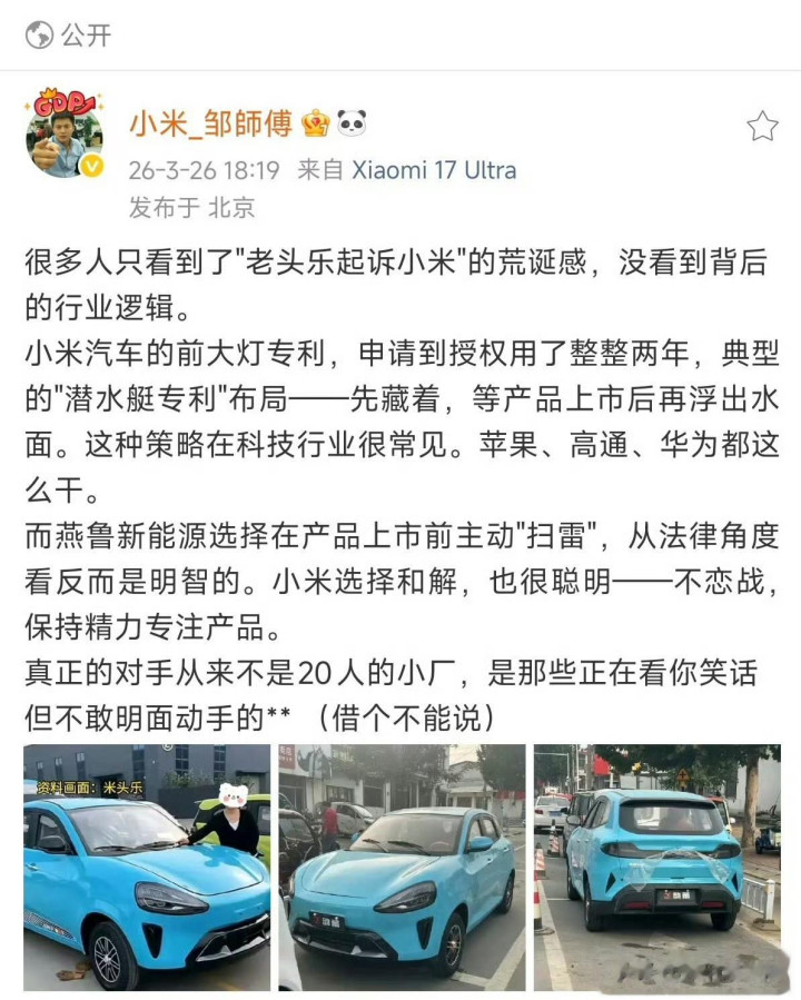 有人说这小厂是碰瓷,想蹭小米流量,毕竟这么一闹,全国都知道山东有个叫燕鲁的老头乐厂了,比请明星代言还划算。也有人说小米格局大,不跟小厂一般见识,省得浪费时间精力,专心搞自己的车才是正事。
