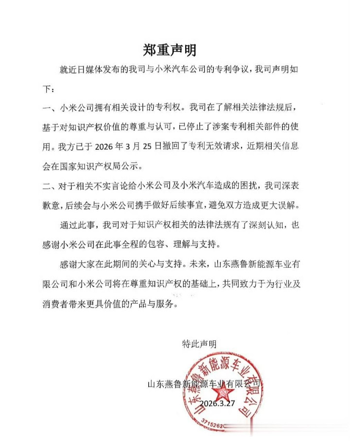 谁能想到,口审前一天,也就是3月25号,剧情直接大转弯。燕鲁新能源突然发声明,承认小米的专利权,立马撤回专利无效请求,还公开道歉,说之前的不实言论损害了小米声誉,最后还感谢小米的包容与支持。